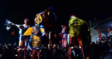 安徽省傩戏传承人进行傩戏高跷马表演